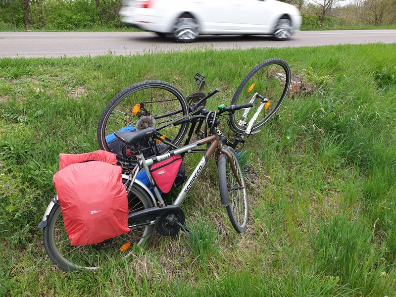 A bicikliket az árokparton hagytuk. Visszafelé Nóri bringája akrobata mutatvány keretében tótágast állt, oly módon, hogy Nóra bringáját nem lökte fel. Csak mellé bukfencezett. 😀