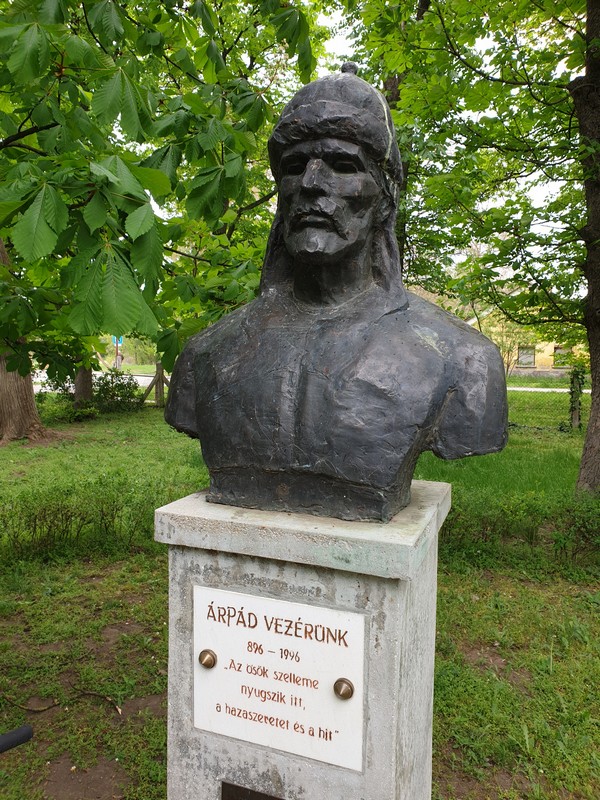 Bőven volt időm, úgy számoltam, hogy 4-re biztosan Szarvason leszek. De nem szerettem volna kicentizni. Árpádhalomra érve először a Károlyi-Berchtold kastélyt néztem meg, majd a pecsétet. A bolt 12-14 között zárva. Én 12:30-ra értem oda. Egy gyors telefon, a bácsi már jött is kinyitni a boltot. Erről a lehetőségről előzetesen olvastam, de azért nem szabad 100 %-nak venni, hogy mindig elérhető ez az opció. Vettem pár apróságot és a lehetetlen helyen rögzített pecséttel végzett tornamutatvány után tekertem is tovább. Pár fotót azért még lőttem a nevezetességekről: kastély, Árpád vezér szobra (egy kosár / foci pálya szélén).