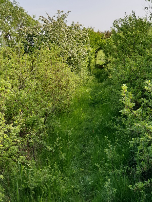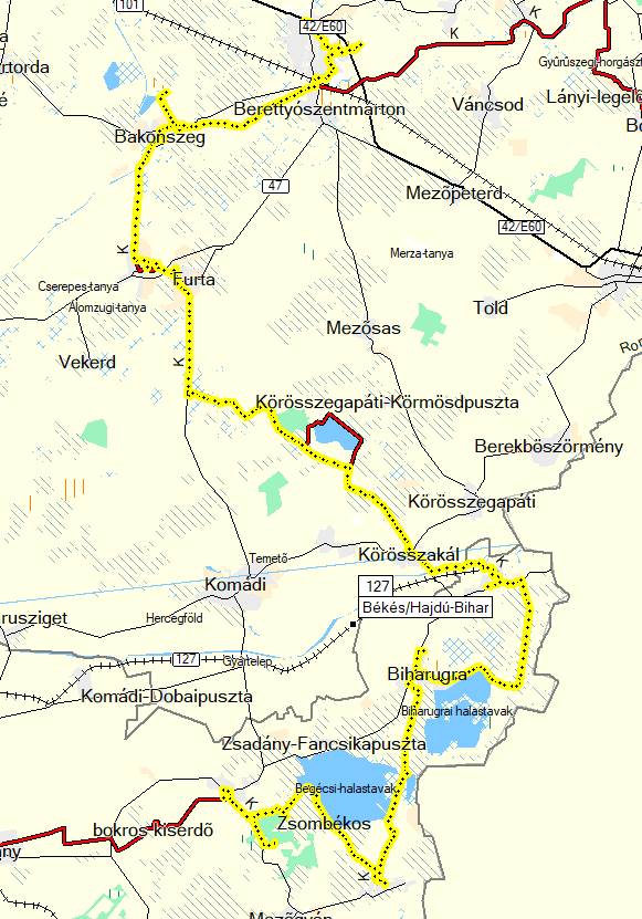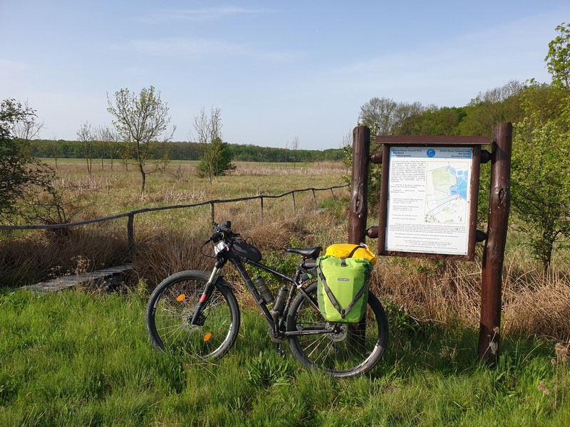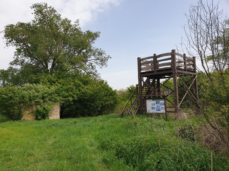 Picit vissza kellett gurulnom az aszfalton, aztán elkezdődött egy elég szenvedős szakasz, ami gyakorlatilag Gesztig tartott. Volt itt minden, de főleg rázós földút. Nagyon lassan tudtam haladni. A jelet is nehéz volt követni, de volt egy nyitott rész, ahol a mezőn át nem is nagyon volt járt út. Vaddisznó túrásokon és nedves füvön kerekeztem. Egy szakaszon a bokrok között szabályos alagutat alkotott a növényzet, a bringa kormánya éppen elfért. Néhol mélyen le kellett hajolnom a beborult ágak miatt. Végre elértem egy kilátót, pár info táblával. Innen a tó partján vezetett egy gát. Az sem volt sokkal jobb. Figyelni kellett a szúrós bokrokra. Ahol végre picit jobban kijárt lett a szekérút, ott egy kéktúrás térképet olyan helyre tettek ki, ami már nem is a kéken vezet. Ezt az oszlopon lévő jelzések ellenére is könnyű benézni. Megtévesztő. Végül a GPS-re hagyatkoztam. Egészen Geszt határáig tartott ez a nehezen járható, de csodaszép rész. Igazi buja természet.