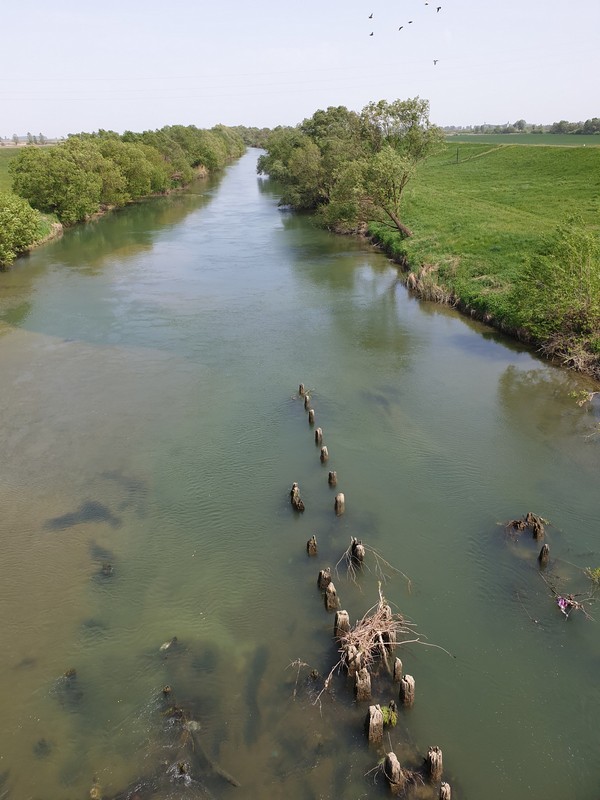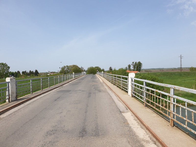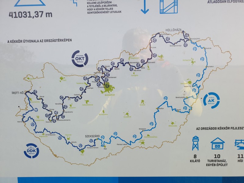 Innen egy rövid szakasz vezet Bakonszegig. Mielőtt beér a műút a településre, a kék felvezet a Berettyó aszfaltozott töltésére. Itt szuper jó volt gurulni a reggeli élmények után. A nap kitartóan sütött. Talán ez volt a 2 hét legmelegebb délutánja. Nyugodtan suhantam, amikor feltűnt egy vándor és a nagy hátizsákja. Nagyon lassan haladt, közelebb érve a merev mozgása inkább csoszogásnak tűnt, mint lépésnek. Mint hamarosan kiderült a szintén AK-t teljesítő András is Szekszárdról indult. Éppen csak kicsit előbb, mint én. Neki Gemenc még nem volt száraz.