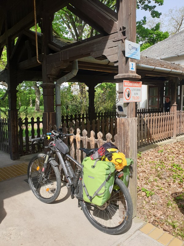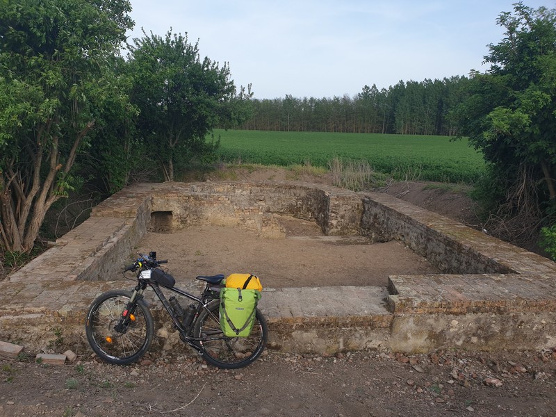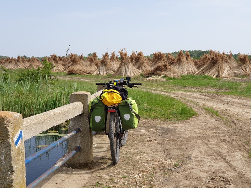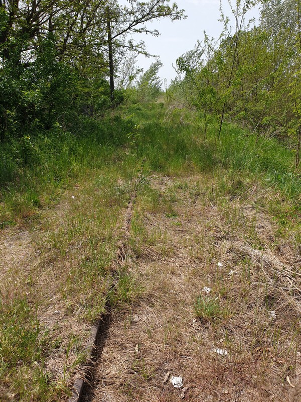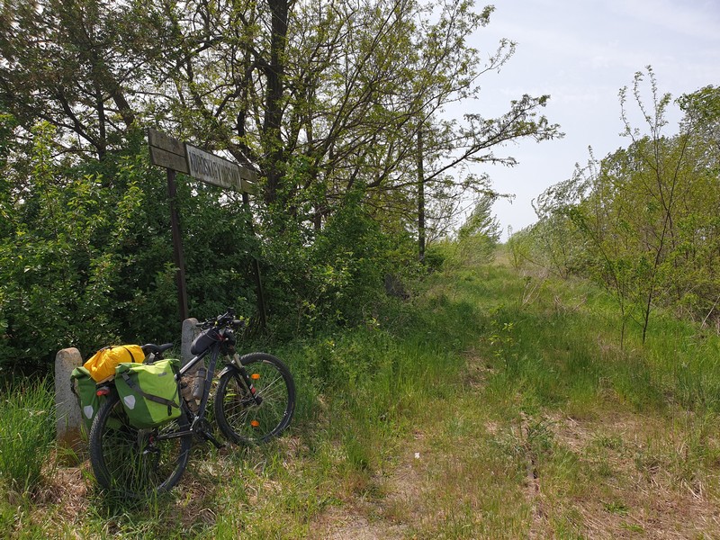A faluból egy elhagyatott állomáson és vasúti síneken vezetett ki az út. Egyszer már megfogadtam, hogy nem tekerek többet talpfák között, erre itt állok a csomagokkal. Már bokrok, kisebb fák is nőttek a sínek között, de az a párszáz méter egész könnyen teljesíthető biciklivel is. Egy nagy bánatom van, a GoPro épp ezen az érdekes és mutatós szakaszon döntött úgy, hogy nem rögzít semmit. Ezt már csak a töltésen vettem észre. Ki is kellett vennem az akkut, hogy újra magához térjen. Valószínűleg túlmelegedett, vagy nem tudom.