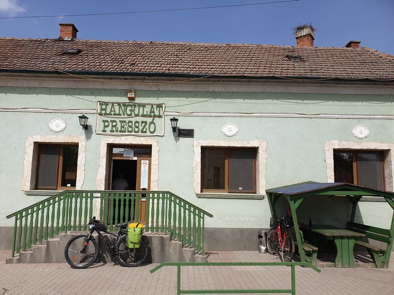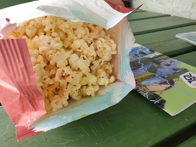 Furtáig nyíltabb, kissé szeles időben tekergett a jól bringázható földutak sora. Egy MOL teleptől egészen a faluig aszfalt vezetett. Itt egy gyors pecsét a Hangulat presszóban és ebédre egy csomag popcorn, amit a hölgy készségesen elkészített nekem.