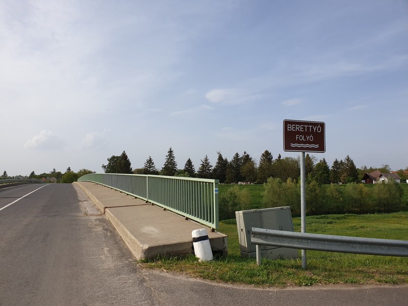 Bakonszegre beérve én megnéztem a Nadányi-Miskolczy-kúriát, majd együtt mentünk a Bessenyei György-emlékház udvarán található pecsétig. Itt megkértem, hogy írja alá az AK-s füzetemet, majd minden jót kívánva egymásnak elbúcsúztunk. Én még rábeszéltem magam egy kis kitérőre a Kálló-patak (-ér?) felkeresésére. A tegnapi nagy táv után így is eleget tekertem, több kitérős nézelődést nem akartam mára beiktatni. Berettyóújfaluig még hátra volt pár kilométer, szerencsére a töltés ezen része is végig aszfaltos volt. A folyó mellett viszonylag gyorsan elfogyott ez a táv is. A városba beérve az első állomás a vízügyi telep kerítésén található telep volt. Érdekes módon azonnal megjelent egy dolgozó a kapuban, aki kedvesen ugyan, de alaposan kifaggatott: honnan tartok hová, hasonlók. Mikor egy kollégája is csatlakozott, eljött az én időm. Az ajánlott vacsorahelyről kérdeztem, végül azt ajánlották, ahol megszálltam. A Móló Panzió – este kiderült – több szempontból is pompás választás volt. Most nem arra az óriási színpadra gondolok, ami a kerthelyiségben volt felállítva és egy rock banda tépte a húrokat hajnalig. Abból semmit nem hallottam, mivel bundának álcázva magam aludtam. Felőlem a helyi Stihl fűrészes csapat is tarthatott volna „hangbeállást”! 🙂