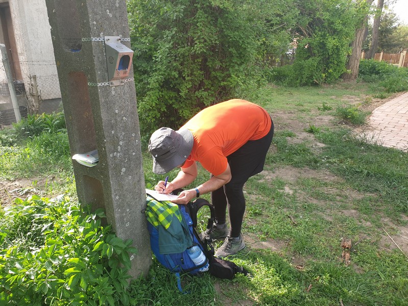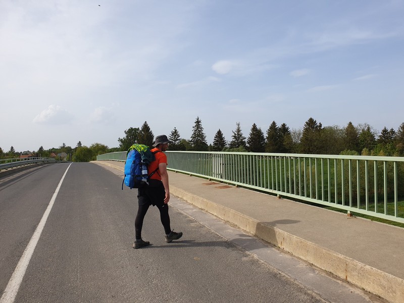 Először lelassítottam és üdvözöltem, beszélgetni kezdtünk. Látva az állapotát, felajánlottam, hogy tegye a hátizsákját a bringámra. Ezzel nem élt: „saját erőből” haladt tovább. Leszálltam a nyeregből, mert ilyen lassan a csomagokkal már nem tudtam tekerni. A faluig és a pecsétig hátralévő kb. 1,5 km-t együtt sétáltuk le. Nem irigyeltem, állítólag sok vízhólyagot is összegyűjtött. Nagyon-nagyon fáradtnak tűnt. Mikor beértünk, akkor beismerte, hogy nagyon sokat segített neki az érkezésem. Mikor megtudtam tőlem, hogy holnapra esőt jósolnak, azonnal egy pihenőnap beiktatása mellett döntött. Neki is előre le volt foglalva az összes szállása, mint nekem. Ő aludt előttem Zsadányban is.