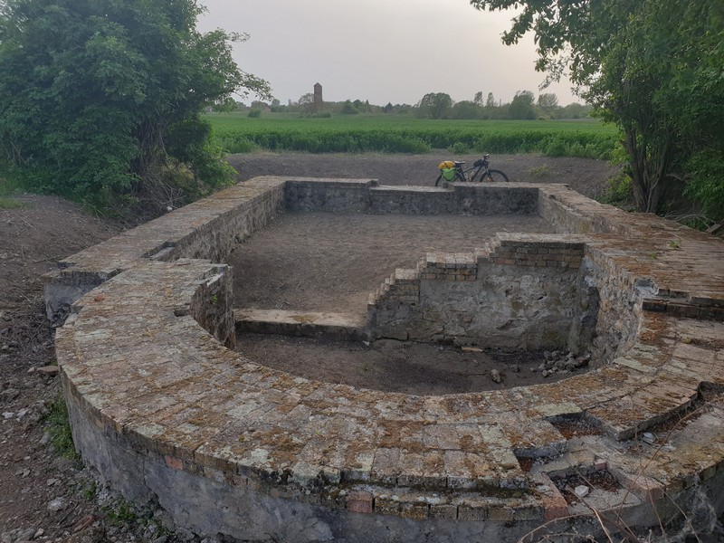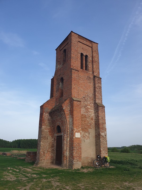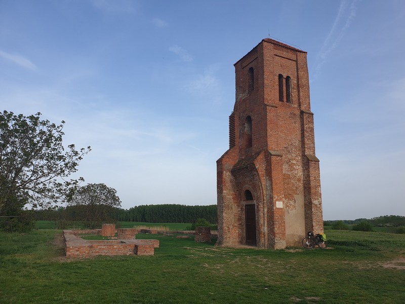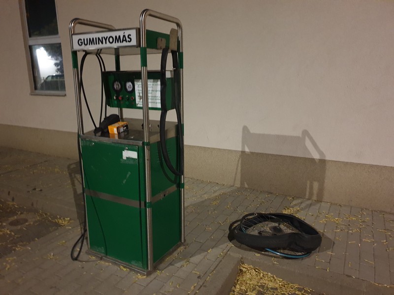 Menjünk csak sorban. A pecsét beszerzése után a herpályi toronyromot és a Fehértemplom-romot kerestem fel. Valószínűleg itt kaptam valahol azt a dupla defektet, ami az estére adott egy kis elfoglaltságot. Akkor vettem észre, hogy ereszt a gumi, akikor megérkeztem a szállásra. Bejelentkeztem, lepakoltam, lezuhanyoztam, megvacsoráztam. Jó szállás, tisztességes konyha. Egyedül a bicikli elhelyezése miatt aggódtam, mivel kint mutattak egy fedett helyet. A koncertre érkező rockerek ott haladtak el. Végül ez is megoldódott, a bringa biztonságban volt velem éjszaka. A defekt előtt – egy kis pumpálást követően – a helyi Lidl-be mentem. Vettem pár apróságot a másnapi úthoz, majd a két(!) MOL kút közül a távolabbinál lemostam a járgányt a nagynyomásúval. Ezután a másik benzinkút következett, mert a sűrítettlevegő csak ott működött. Ez a kút volt a szállásommal szemben, az út másik oldalán. A defektet most hamar megtaláltam, ha lett volna Slime-om, ezt megfogta volna. Ragasztottam, összeszereltem, mindez már nagyon gyorsan. A kút ugyanolyan egységgel rendelkezett, mint a hajósi pincéknél lévő. A nyeregnél fogva fel tudtam akasztani a bringát, a szerelés így majdnem F1 gyorsaságú volt. 😉 Visszamentem a szállásomra, éppen a feleségemmel beszéltem telefonon, amikor ránéztem a szobámba felvitt biciklire. Lapos volt a hátsó. Hú de jó, hogy ez nem reggel derült ki, amikor lementem volna pakolni! Szóval kivettem a hátsót és a szükséges dolgokkal – papucsban – átsétáltam a kúthoz.