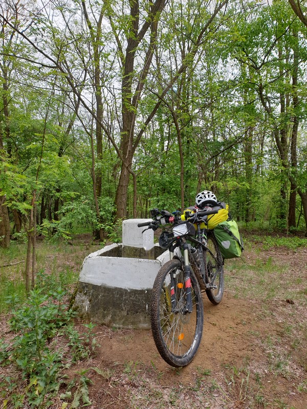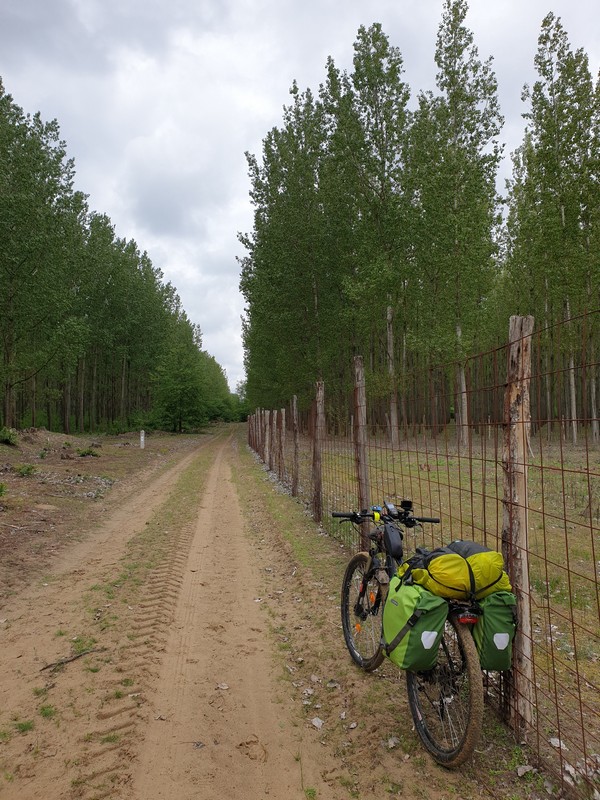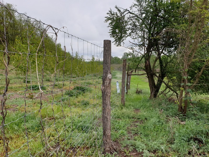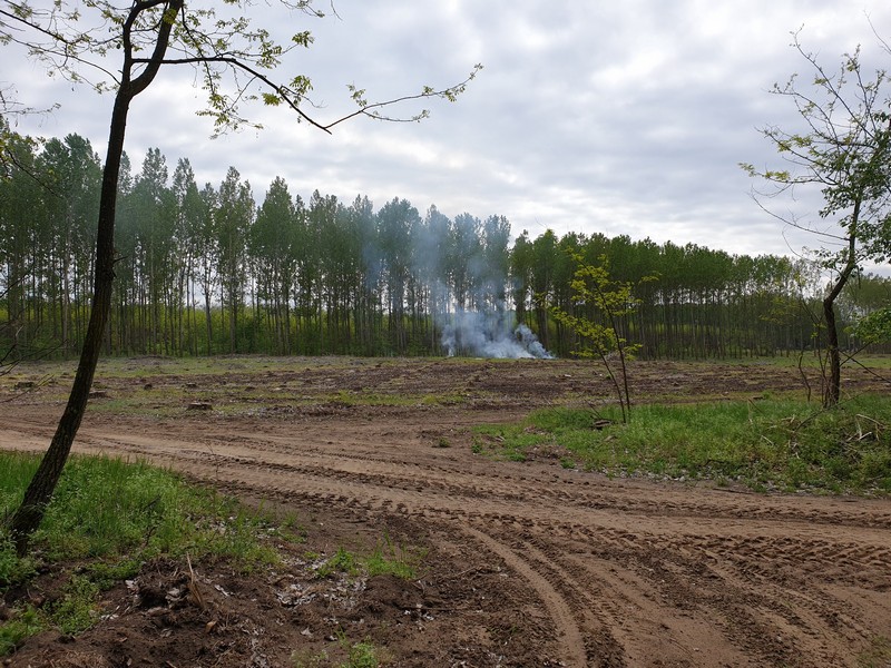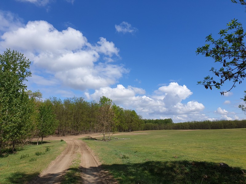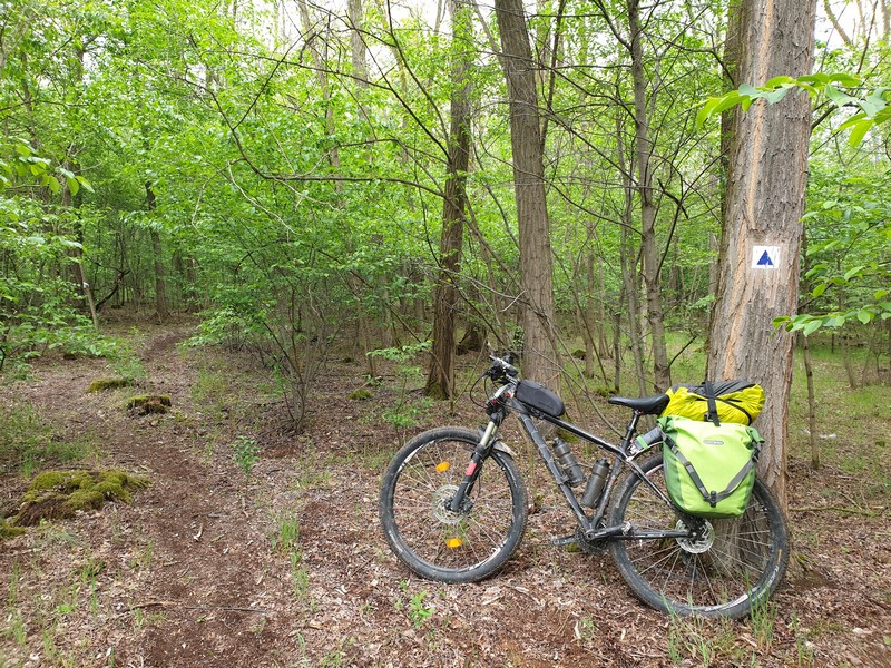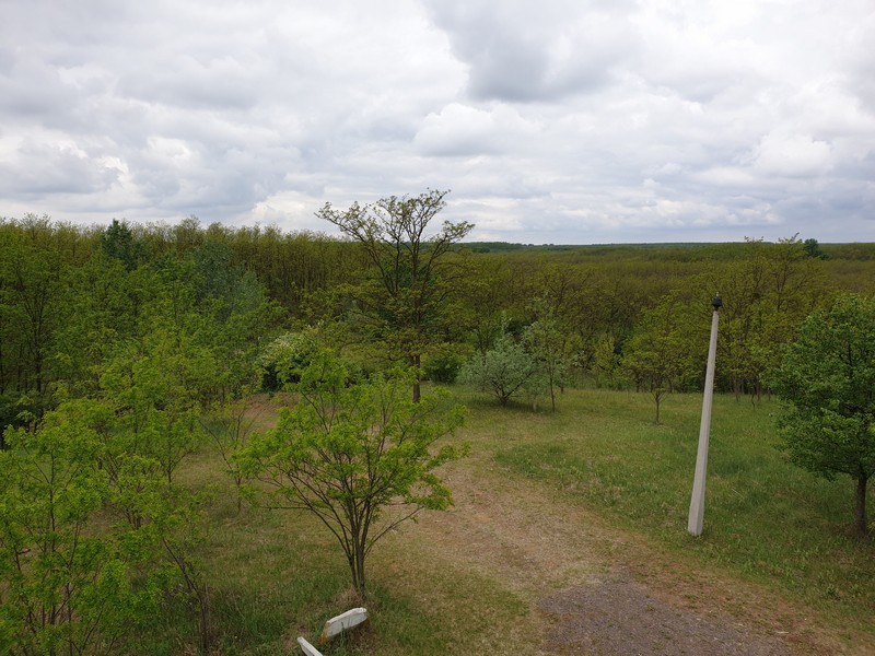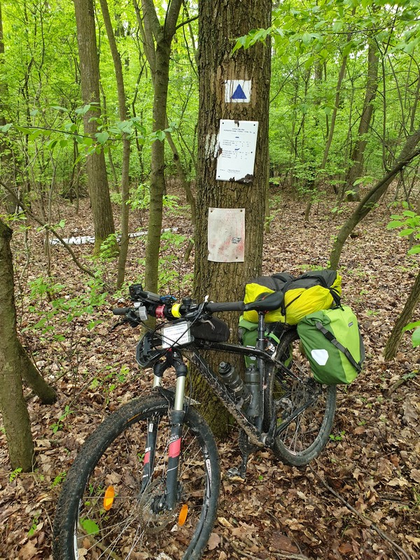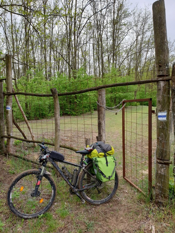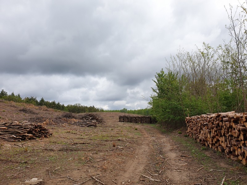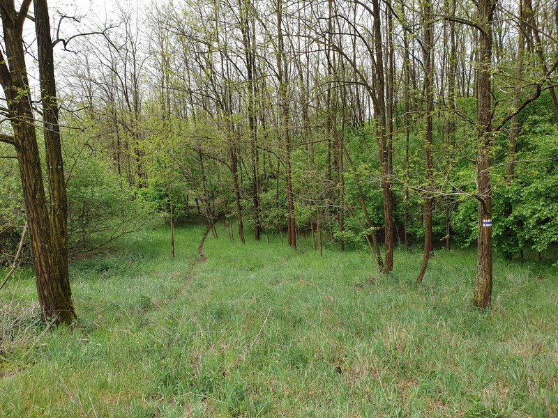 Nyíracsádot elhagyva keleti irányba tértem le az útról, itt egy olyan rész következett, ahol az utat benőtte a növényzet. Erre többen is figyelmeztettek. Mentem addig, amíg lehet. Ahol a jelzés eltűnt és egy kerítés is fel volt húzva a GPS-en látható nyomvonalon, ott fordultam vissza. Lehet, hogy gyalogosan, bozótharccal át lehet menni, ám engem nem vonzott a sok akáccal tarkított kaland. Visszafordultam és a műúton kerültem kicsit, majd az első lehetséges ponton újra kelet felé vettem az irányt. Egy tarvágásos részen haladtam át, a fákat nagy halomba hordák össze. Figyelnem kellett itt is a tüskékre, a földön heverő ágakra. Nem hiányzott egy küllőtörés. Ezt a szakaszt egy kellemes, rövid ösvény váltotta fel. Ez igen hangulatos volt. Már ezért megérte erre jönni és nem az aszfalton maradni. Friss, tavasziasan zöld volt minden.