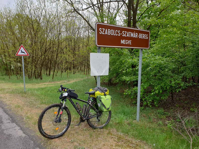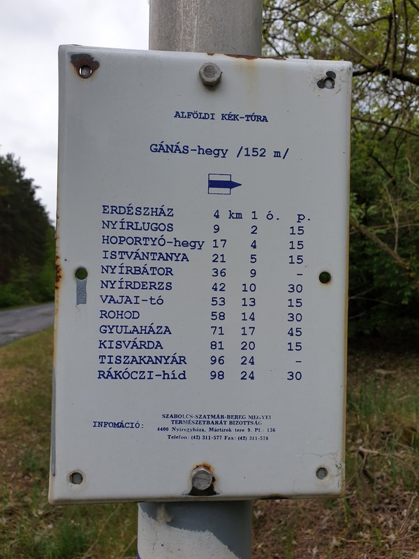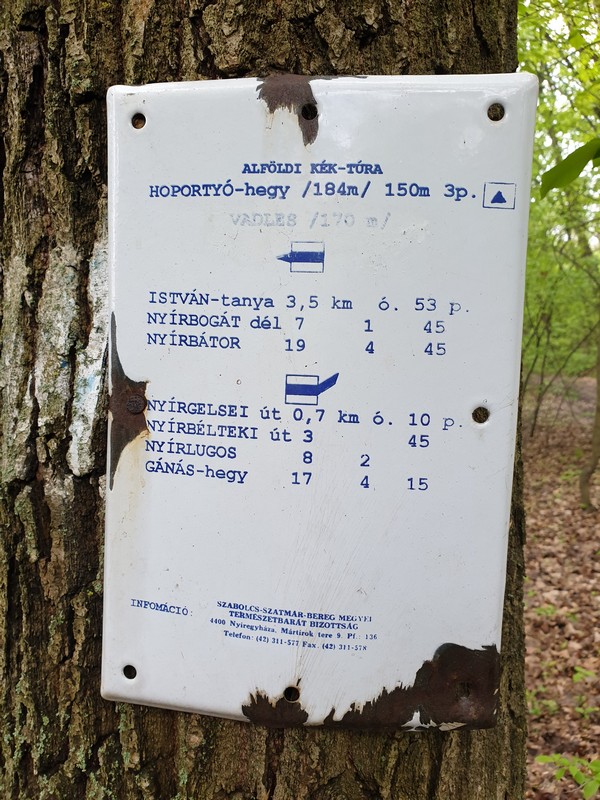 Nyírlugost magam mögött hagyva egy hosszú erdős szakasz következett. Az Alföld legmagasabb pontján már jártam, de nem lehetett kihagyni, hogy felmenjek a szédítő 183,5 méter magas helyre. A Hoportyó nem kínál kilátást. Se panoráma, se oxigénhiány. Azért a végén toltam a biciklit a sűrű erdőben felfelé kanyargó kék háromszög jelzést követve. A csúcsfotó után legurultam, ami ismét mókás downhill élmény volt. Megnéztem és lefotóztam a másik régi kéktúra táblát is, majd az istvántanyai kocsmáig, azaz a pecsétig meg sem álltam. 14 óra előtt már ott is voltam. A ma délelőtt jól telt, az utakon is jól lehetett tekerni.