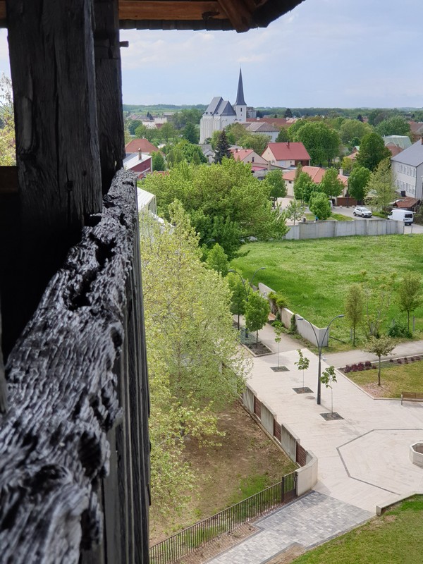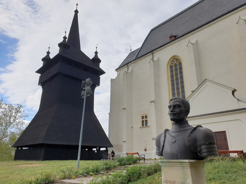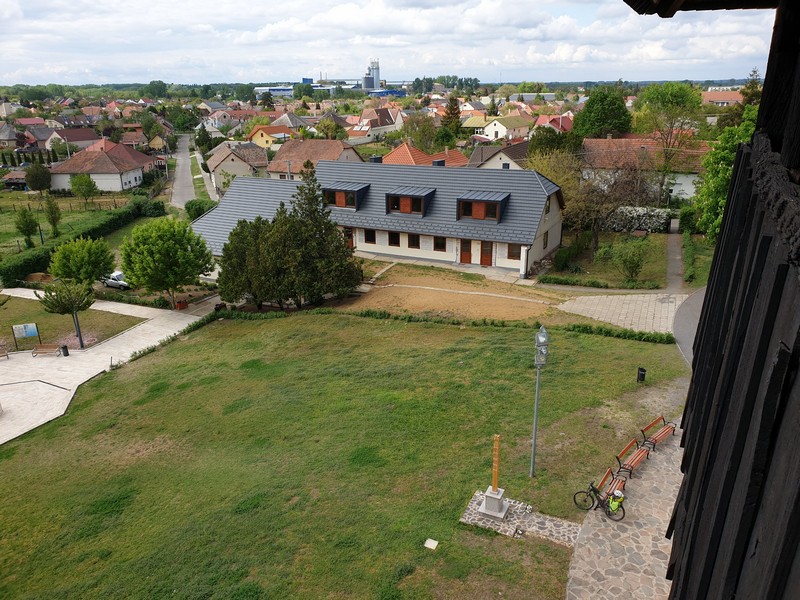 Nyírbátorba beérve végig gurultam a kéktúra jelzésén, egészen a katolikus templomig. A tónál készítettem pár fotót. A hely ismerős volt, de a napsütésben nem lehetett kihagyni a sok-sok helyszínt és a fotózást. Innen a református templomhoz tekertem, ahol éppen ketten mentek fel az óriási harangláb tetejébe. Rögtön meg is kérdeztem, hogy felmehetek-e én is szétnézni. Szívesen láttak, így a biciklit lent hagyva megnéztem a napsütésben én is felülről a várost. Két harang van a csupa fa, masszív építmény tetejében.