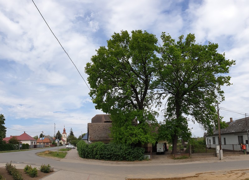 Beérve a faluba, a kereszteződésben megtaláltam a Tölgyfa presszót és a falára rögzített pecsétet. Két óriási tölgyfáról kapta a hely a nevét, az egész épület eltörpül alattuk. Nem messze volt a Nyírkarász-Garay vár, ahol egy teljesen jól kivehető földvár helyreállított nyomait néztem meg. Az árok teljesen körbeveszi a kis vár alapterületét. Persze semmilyen építmény maradványa nincs már meg, csak egy szobor áll ott.