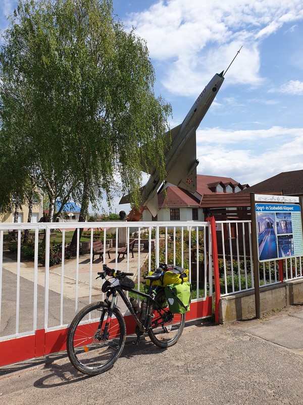 Egy kis aszfalt és egy kis terepezés után begurultam Gyulaházára, Farkas Bertalan szülőfalujába. A kicsit szegényes, olyan szocreál kiállítást azért megnéztem. Mókás a nagy MIG az iskola udvarán. A pecsétet egy elhagyatott sörfőzde teraszán volt. Itt öltöztem át rövid bringás nadrágba, mert már igencsak melegem volt.
