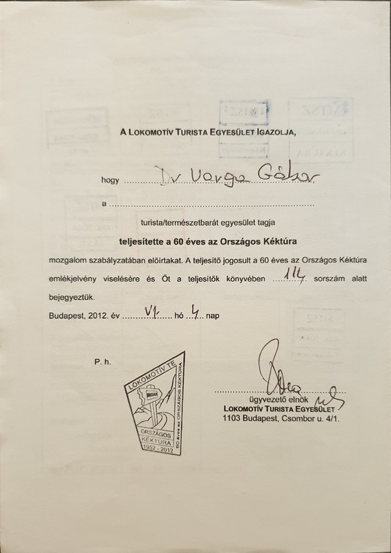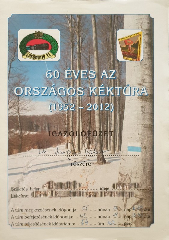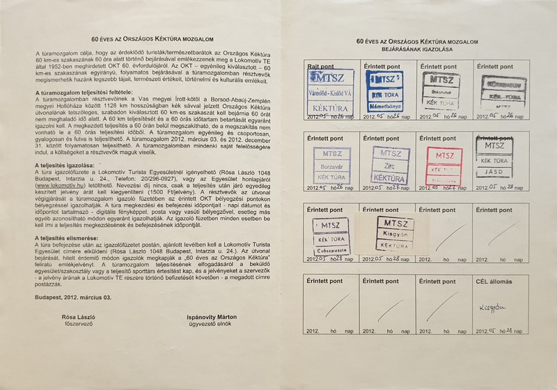 A kedvet – ha szabad erre ilyet mondani – a Lokomotív Turista Egyesület 2012. tavaszán megjelent kiírása hozta meg. Túrázni előtte is szerettem, ez inkább motiváció volt a füzet beszerzésére. A kiírás egyszerű volt: 60 km bejárása 60 óra alatt az Országos Kéktúra 60. évfordulója alkalmából. Az igazoláshoz egy A4 papírra kellett kinyomtatni az ellenőrzőpontokat. Így kezdtem el tervezgetni a teljesítendő szakaszokat.